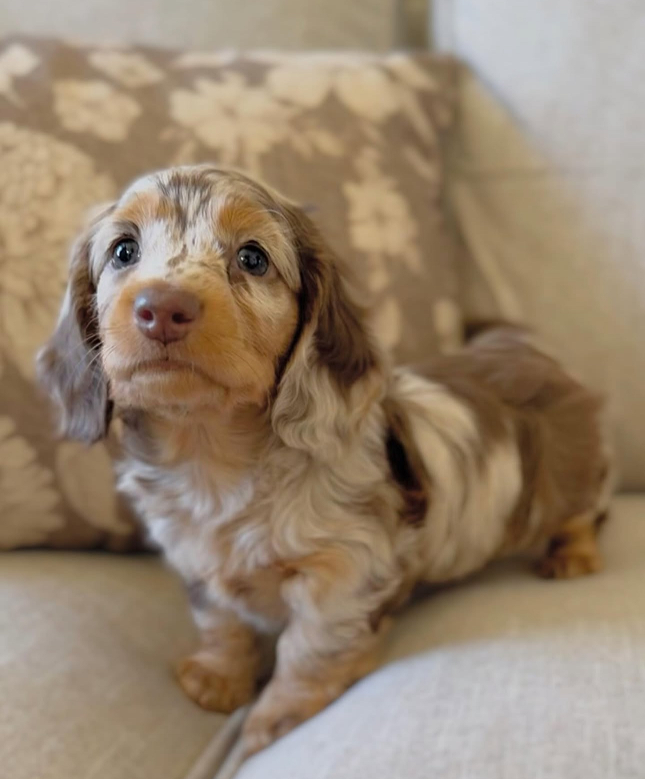 Daisy’s beautiful cream and chocolate dapple coat makes her stand out instantly, but it’s her bright, loving nature that truly steals hearts. She’s playful yet gentle, always tilting her head as if she’s listening to every word you say. Whether she’s exploring new corners or curling up for a nap, Daisy brings warmth and personality wherever she goes.
