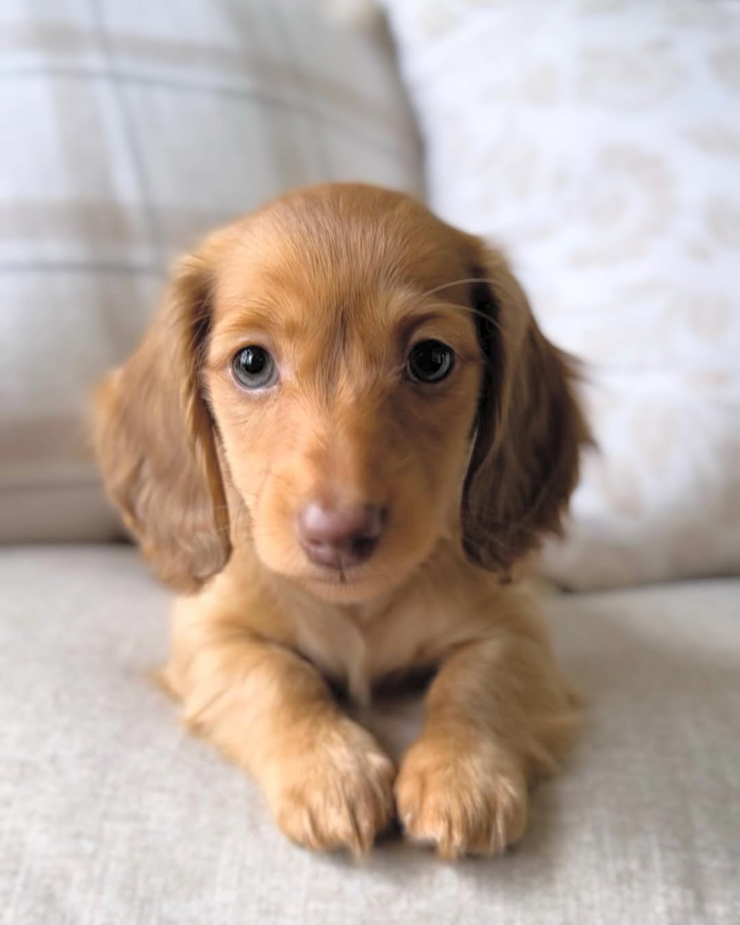 Lindie has a soft golden coat that gleams in the light and eyes that seem to smile back at you. She’s an affectionate little explorer who loves cozy spots and gentle attention. Always calm but full of heart, Lindie brings a quiet joy to every moment the kind of puppy that makes a house feel like home.