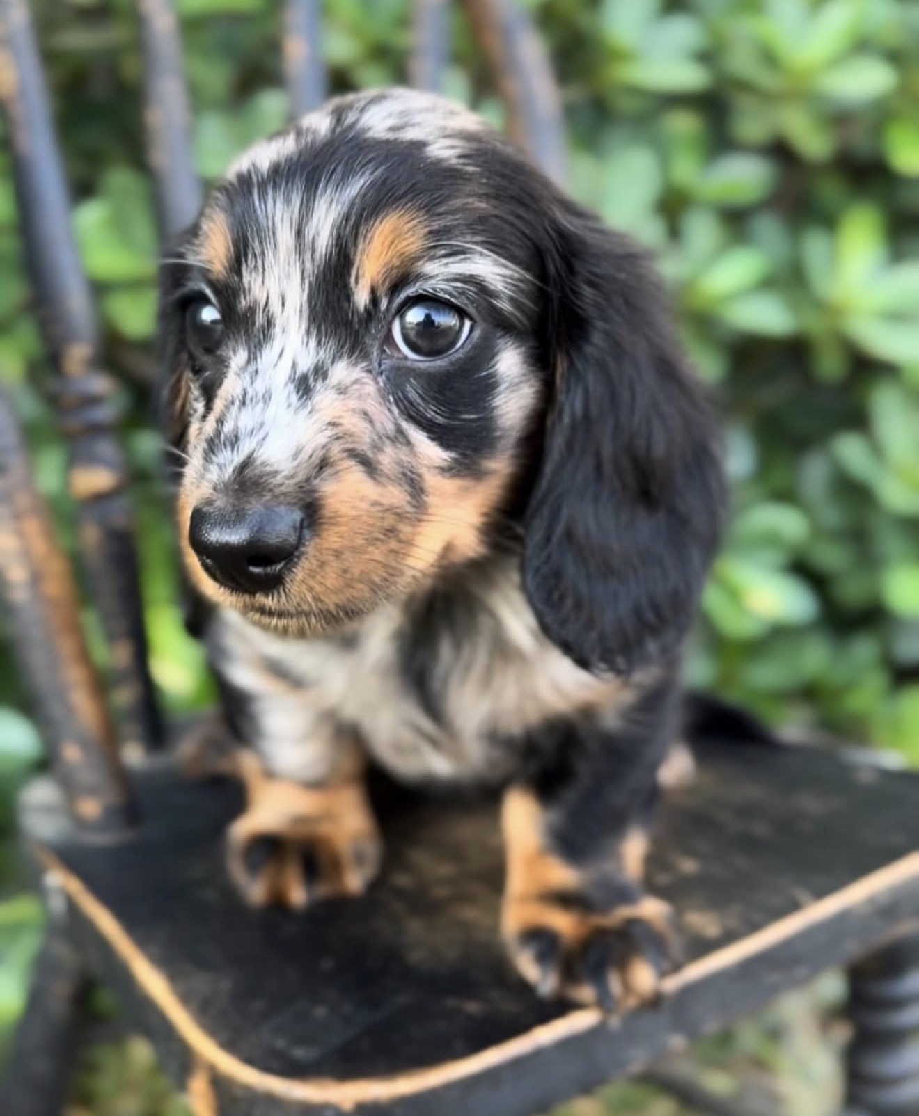With his striking merle coat and those curious, intelligent eyes, Rulo stands out the moment you see him. He’s playful, adventurous, and loves discovering new things whether it’s chasing a leaf or climbing onto a cozy chair for a better view. Rulo has a confident spirit and a loving heart, the perfect mix for anyone looking for a fun, loyal companion.
